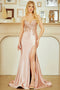 Make a stunning entrance in this exquisite strapless gown by Amelia Couture 8059, featuring intricate beaded appliqués and embroidered details that catch the light beautifully. The structured bodice showcases an illusion scoop neckline with corset boning for a flattering silhouette, while the open lace-up back adds an alluring touch of elegance. A floor-length fitted skirt with dramatic side slit and train creates movement and sophistication. Crafted from luxurious satin with beaded embellishments and fully lined for comfort, this gown transitions effortlessly from prom to galas, red carpet events, and formal occasions. Available in five stunning shades—Gold, Navy Blue, Mauve, Periwinkle, and Victorian Purple—in sizes 0-14.