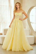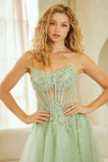 Make a statement in this stunning strapless gown by Amelia Couture 9078, where timeless elegance meets modern glamour. The sheer illusion neckline and intricately beaded bodice with dimensional floral appliqués create an unforgettable silhouette, while the corset boning provides flattering support and structure. Cascading into a radiant glitter tulle skirt with a graceful side slit, this floor-length beauty captures light with every movement. The customizable lace-up back ensures a perfect fit for your special occasion, whether it's prom, a gala, or red carpet event. Available in five gorgeous hues and sizes 0-18, this is the show-stopping formal wear you