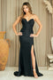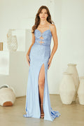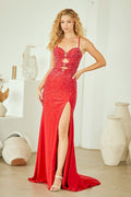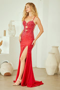 Make a statement in this exquisitely beaded sleeveless gown by Amelia Couture 3103. Featuring a sweetheart neckline with delicate straps and strategic cutouts, this floor-length masterpiece combines elegance with edge. The fully rhinestoned bodice catches every light, while the daring high thigh slit and detachable jeweled center patch deliver show-stopping versatility. An open lace-up back with zipper closure and fitted silhouette create an unforgettable silhouette perfect for prom, galas, red carpet events, and formal occasions. Crafted from beaded jersey with a lined interior and bra cup support, this gown ensures you'll turn heads all night long. Available in Emerald Green, Red, and Periwinkle in sizes 0-14.