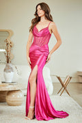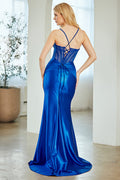 Make a statement in the Amelia Couture 9081, a stunning sleeveless gown designed to captivate. This beaded masterpiece features an illusion sweetheart bodice with corset boning and delicate straps for a flattering silhouette. The open lace-up back and zipper closure add dramatic elegance, while the floor-length fitted skirt with side leg slit creates movement and allure. Crafted from luxurious satin jersey with intricate beaded embellishments, this fully lined gown is perfect for prom, galas, red carpet events, and formal occasions. Available in hot pink and royal blue, sizes 0-12, this is the gown that turns heads and creates unforgettable moments.