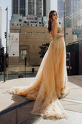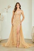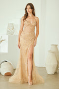 Make a statement in this stunning beaded strapless gown from Amelia Couture. The sweetheart bustier bodice features intricate bead embellishments and corset boning for a flattering silhouette, while the open lace-up back with zipper closure adds an alluring touch. A floor-length fitted skirt with dramatic train and side leg slit creates movement and elegance. Crafted from tulle with beaded details and fully lined for comfort, this versatile gown transitions seamlessly from prom to galas, red carpet events, and formal occasions. Available in champagne, sizes 0-14.