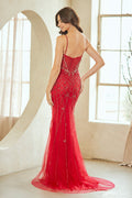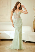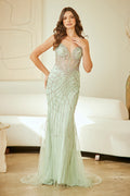 Elevate your formal wardrobe with this stunning V-neck beaded tulle gown from Amelia Couture 2135. Crafted with meticulous geometric beading and shimmering rhinestones across luxurious sheer mesh, this sleeveless design delivers couture elegance at an accessible price point. The plunging V-neckline, corset-boned bodice, and open back create an undeniably sophisticated silhouette, while the floor-length fitted skirt with dramatic train commands attention at any event. Fully lined with a horsehair hemline for structure and a convenient zipper closure, this gown transforms you into the showstopper of prom, galas, pageants, or red carpet moments. Available in champagne, red, and sage green in sizes 2–16.