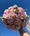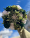 Handcrafted quinceañera bouquet featuring Bahama Blue, Dusty Blush, and Ivory roses, elegantly finished with Rose Gold brooches.