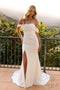 - Skirt: Floor-length fitted skirt with a sweep train and a side leg slit