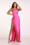 Turn heads in this show-stopping feather long strapless satin gown with a fitted slit skirt by Abby Paris 90200.