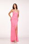 - Details: Make a striking impression in the Abby Paris 90263 Glitter Fitted Sleeveless Slit Gown. This dazzling dress features a sleeveless sweetheart bodice with delicate thin straps, an open sheer back with corset boning, and a zipper closure for a flawless fit. The floor-length fitted skirt is adorned with a side leg slit and a sweeping train, all crafted from glitter knit fabric that shimmers with every movement.