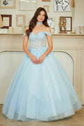 Make a stunning entrance in the Amelia Couture 8064, an enchanting off-shoulder ball gown designed to turn heads. This glamorous creation features an illusion sweetheart bodice with elegant corset boning and a removable choker detail, while the open lace-up back with zipper closure adds modern sophistication. The floor-length A-line skirt, adorned with shimmering glitter tulle, intricate beaded appliqués, and sparkling embellishments, creates an unforgettable silhouette perfect for prom, galas, red carpet events, and formal occasions. Fully lined with a bra cup for comfort and support, this dress comes in pink and light blue, sizes 0-14. Elevate your elegance and confidence in this show-stopping gown that promises to make you feel absolutely radiant.