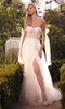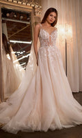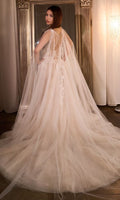Shine on your wedding day with this elegant sleeveless cape wedding dress from Ladivine. This long dress features nude illusion shoulder straps and a sheer low v-neckline on the floral lace-embroidered fitted corset bodice. The floral lace appliques continue into the waistline of the dreamy layered tulle a-line floor-length skirt. A detachable long tulle cape attaches to the shoulder straps and cascades down for a complete fairy-tale look.