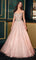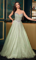 Strapless prom gown by Ladivine featuring a structured corset bodice with vertical lines of beaded embellishments from the sweetheart neckline down to the skirt. The dress has a back zipper closure and flows into a glitter tulle floor-length a-line skirt.