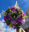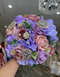 Custom-made long bouquet featuring lilac and purple roses, designed with a garden theme for a natural look. Finished with brooches in the color of your choice.