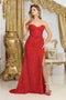 Elevate your night with this May Queen MQ2035 Gown. With a stylish spaghetti strap style and a flattering bustier top, this dress is guaranteed to bring a touch of elegance to any occasion. It's adorned with delicate ruched accents and a daring side slit, giving it a touch of sophistication and allure. With its sweeping train and easy to use back zipper, this gown will have all eyes on you as you make your way across the room. Perfect for a fancy Gala, Prom or Red Carpet event.