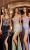 Strapless unique yellow-orange prom gown fully adorned in 3D floral appliques. This dress features a straight neckline on the sheer fitted corset bodice and a midrise open back with a lace-up closure. The dress transitions to a full-length a-line floral textured skirt with a high-leg slit for a breathtaking look.