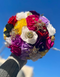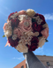 Handcrafted quinceañera bouquet featuring champagne beige and ivory roses, elegantly finished with an ivory ribbon and brooches in your color preference. Please note that brooch styles may vary based on availability.