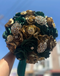 Handcrafted quinceañera bouquet featuring emerald green and ivory roses, elegantly adorned with emerald green jewels and gold brooches. The bouquet has a thick handle finished with additional jewels.