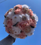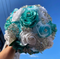 Handcrafted quinceañera bouquet featuring lavender and turquoise roses, accented with gold brooches and seashells.