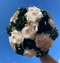 Handcrafted quinceañera bouquet featuring emerald green and gold roses, elegantly finished with gold brooches.