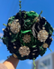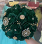 Handcrafted quinceañera bouquet featuring emerald green, ivory, and gold roses, elegantly finished with silver brooches.