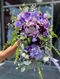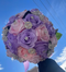 Handcrafted quinceañera bouquet featuring jasmine purple, lilac, and sage-colored roses/flowers, elegantly finished with silver brooches.