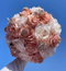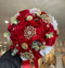 Handcrafted quinceañera bouquet featuring roses in red shades, accented with silver butterflies.