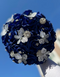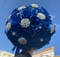 Handcrafted quinceañera bouquet featuring royal blue roses, accented with gold brooches.