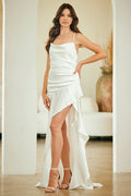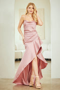 Elevate your formal wardrobe with the Amelia Couture 6131, a stunning sleeveless satin gown designed to turn heads. This sophisticated piece features a graceful cowl neckline with delicate straps and an alluring open lace-up back finished with a zipper for secure closure. The floor-length silhouette showcases a fitted skirt with an elegant train, ruffled detailing, and a dramatic side leg slit that adds movement and allure. Crafted from luxurious satin and polyester with a fully lined interior and built-in bra cup support, this gown flatters every figure in sizes 2-16. Available in five stunning shades—Rose Pink, Baby Blue, Black, White, and Yellow—it's the perfect choice for prom, galas, red carpet events, weddings, and any occasion demanding timeless elegance.