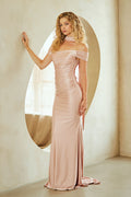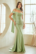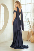 Command an entrance in this stunning satin gown from Amelia Couture 3101, designed to make you unforgettable. The elegant off-shoulder neckline features a removable scarf for versatile styling, while the fitted silhouette flatters your figure beautifully. An open lace-up back with zipper closure adds allure, and the floor-length skirt with dramatic train and side slit creates movement and sophistication. Crafted from luxurious satin with a fully lined interior and built-in bra cup for comfort and support, this gown transitions seamlessly from prom to galas, weddings, and formal events. Available in Blush Pink, Royal Blue, Sage Green, and Navy Blue in sizes 0-16.