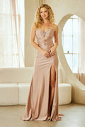 Elevate your formal wardrobe with this stunning strapless satin gown by Amelia Couture 3102. Crafted from luxurious high-shine satin with intricate beaded embellishments, this dress commands attention with its modern silhouette and undeniable elegance. The sweetheart bodice features strategic ruching and a striking midriff keyhole cutout adorned with jeweled accents, while the dramatic thigh slit delivers maximum impact. An open lace-up back with zipper closure and fully lined construction ensure a flawless fit and all-day comfort. Perfect for prom, galas, red carpet events, or any occasion demanding sophistication, this floor-length gown flatters every figure. Available in Dusty Rose, Sage Green, and Navy Blue, sizes 0-14.