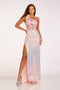- Details: Make a grand entrance in the Abby Paris 90228 gown, featuring a stunning sequin print that catches the light. The sleeveless illusion V-neckline with corset boning enhances the structured bodice, while the floor-length fitted skirt and dramatic train add sophistication. Designed with delicate thin straps and an open back with a zipper closure, this gown is the epitome of timeless glamour.