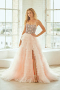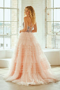 Radiate sophistication in this breathtaking Amelia Couture gown, expertly crafted for your most memorable occasions. The sleek square neckline with delicate straps showcases an open back design secured with a smooth zipper, creating an irresistibly elegant silhouette. Intricate beading adorns the fitted bodice, while the voluminous A-line skirt cascades to the floor with dramatic tiered ruffles and a striking train. Constructed from luxurious tulle and polyester with an integrated bra cup and full lining for all-day comfort and confidence. Ideal for proms, red carpet events, galas, weddings, and formal celebrations. Offered in light pink, sizes 0-14.
