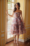 - Bodice: Sleeveless semi-sweetheart design with corset boning and ribbon bow straps