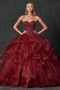 Captivate the room in this bead embroidered long strapless sweetheart dress with flounced glitter skirt by Juliet 1424. Fully beaded sweetheart bodice, full tiered skirt accented with horsehair trim. Detachable sleeves and matching bolero jacket included.