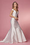 Imagine yourself wearing this stunning floor length wedding gown for your big day! This full-length mermaid wedding dress by Nox Anabel JS924 is truly one of a kind! It features an off the shoulder lace strap with a boned bodice for added support. The mixture of lace and tulle really add to the beautiful of this gown. An ideal long dress for weddings or even debutantes!