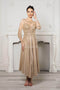 Experience timeless sophistication with the May Queen MQ2108 tea-length chiffon dress. Its elegant A-line silhouette is enhanced by intricate floral lace appliques and sparkling beadwork on the bodice. Delicate sheer quarter-length sleeves and a flattering V-neckline add graceful charm, while the flowing pleated skirt ensures effortless movement. Ideal for weddings and formal events, this dress perfectly balances classic beauty with modern elegance. Choose from Dustyblue, Gold, or Victorian Lilac to make a stunning impression at your next special occasion.