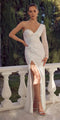 - Skirt: Floor-length fitted silhouette with a dramatic sweep train and high side slit