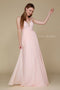 This form-fitting evening dress features a sleeveless plunging V-neckline bodice secured with a sheer illusion panel, jeweled bands around the empire waist, an alluring open V-back, a full-length skirt that ends with a floor-sweeping train, and a zipper closure.