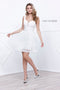 The elegant sleeveless bodice is filled with lace overlay in a chic high scoop neckline. Adorned with twinkling tonal jewels at the waist, this exquisite ensemble drapes to the mid-thigh hem in soft fluttering waves of the wire-edge hem.