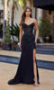 Sleeveless prom dress by Nox Anabel featuring a sheer crystal-embellished fitted corset bodice with a sweetheart neckline and thin shoulder straps that crisscross into the strappy adjustable lace-up open back. A shimmering satin floor-length a-line skirt with a draped floor-length side sash from the hips and a high-leg slit completes the look for this glamourous dress.