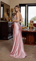 Sleek and sexy satin floor-length prom dress by Nox Anabel featuring a structured corset bodice with a beaded-embroidered waist and embellishments on the sides. This design has a sheer plunging v-neckline and thin shoulder straps that crisscross into the strappy adjustable lace-up open back detail. The smooth shiny fitted sheath skirt with a high-leg slit flows gracefully to the floor into a subtle sweep train for an effortlessly elegant look.