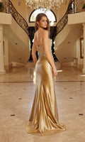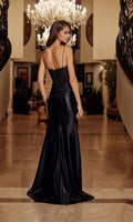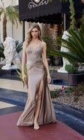 Elegant sleeveless prom dress by Nox Anabel featuring a sheer beaded bodice with delicate spaghetti straps, a sweetheart neckline, and a midrise open back with a zipper closure. The dress transitions to a sleek satin floor-length skirt with a gathered waist detail and a high-leg slit.