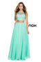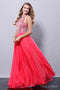 LONG STRAPLESS PROM CHIFFON DRESS ADORNED WITH BEAUTIFUL BEADS ON THE TOP AREA FLOWER LIKE EMBROIDERY AND A THIN SATIN BELT AS AN EXTRA COMPLIMENT.