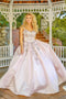 Imagine yourself wearing this stunning floor length wedding gown for your big day! This full-length A-line wedding dress by Nox Anabel JE920 is truly one of a kind! It features a V-neckline with sheer insert panel, laced bodice and button up back. An ideal long dress for weddings or even debutantes!
