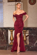 Step into the spotlight in this stunning Ladivine CM387 gown, where timeless elegance meets modern glamour. The off-shoulder illusion sweetheart bodice features intricate beaded embellishments that catch the light beautifully, while the structured corset with lace-up back provides a flattering, confidence-inspiring silhouette. Luxurious satin and tulle fabrics flow into a floor-length fitted skirt with a dramatic side slit and train, creating an unforgettable silhouette for any formal occasion. From red carpet events to galas and weddings, this versatile gown delivers the sophisticated polish you deserve. Available in Black, Burgundy, and Teal, sizes 6-20.