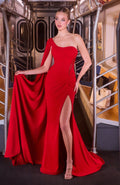 Make an unforgettable impression in this stunning one-shoulder gown by Ladivine CM8428. Featuring a sculpted asymmetrical bodice with a dramatic cape sleeve, this dress combines modern elegance with timeless sophistication. The fitted silhouette hugs your curves beautifully, while intricate beading and ruched detailing add luxurious dimension. A thigh-high slit and flowing train create movement and allure for any formal occasion. Crafted from smooth stretch fabric with a fully lined interior and secure zipper closure, this gown delivers both comfort and confidence. Perfect for galas, black-tie events, weddings, or red carpet moments. Available in black and red, sizes 4-20.