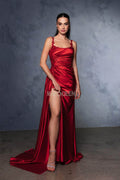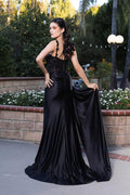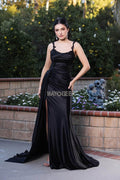 Turn every head with the May Queen MQ2145, a dress that blends timeless beauty and modern allure. The satin ruched bodice accentuates your curves, while lace applique and beaded detailing adds a delicate and luxurious touch. Embellished thin straps complement the scoop neckline for an elegant finish. The ensemble also features a high slit, allowing for graceful movement and a bold statement. Whether attending a formal event or a grand gala, May Queen MQ2145 promises to deliver poise and sophistication. Models are wearing Black, Dustyblue, Eggplant, Navy, Red, and Sage colors.