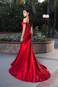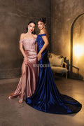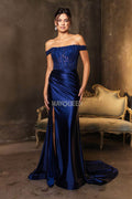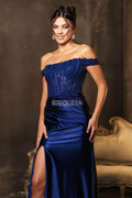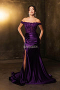 Let romantic elegance define your look with this finely crafted May Queen MQ2146 gown. This satin design features an exquisite illusion corset bodice with floral embroidery and beadwork, paired with cap sleeves that frame your straight across off-shoulder neckline beautifully. The ruched detailing embraces your curves, leading into a smooth sheath silhouette and finished with a statement-making thigh-high slit. Designed for memorable evenings, the May Queen MQ2146 will make you feel graceful and sophisticated all night long. Models are wearing Eggplant, Navy, Red, and Rosegold colors.