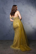 | Details: | Feather Accents, High Slit, Off-Shoulder Sleeve, Detailed Beadwork, Side Drape, Sweep Train |