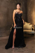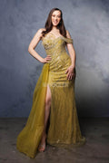 Indulge in luxury with May Queen RQ8178B, an impressive sheath dress thoughtfully designed for maximum impact. Featuring a dazzling off-shoulder sleeve and sweetheart neckline paired with an artfully crafted feather-accented bodice, this dress embodies a luxurious aesthetic. The high slit and meticulous beadwork combined with shimmering glitter embellishments enhance the drama and charm of this piece. May Queen RQ8178B is perfect for glamorous evenings, upscale celebrations, or any event where you want to impress with elegance and sophistication. Models are wearing Black, and Kiwi colors.
