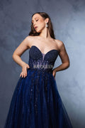 Bring elegance and sparkle together with this May Queen RQ8184 gown designed to captivate. The gown showcases a strapless illusion bodice richly adorned with beadwork and lace appliques, adding dimensional texture and brilliance. The plunging sweetheart neckline softens the look...