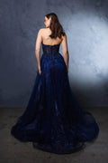 Details: Strapless, Illusion Corset Bodice, Beaded, Layered Skirt, High Slit, Sweep Train