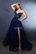 Bring elegance and sparkle together with this May Queen RQ8184 gown designed to captivate. The gown showcases a strapless illusion bodice richly adorned with beadwork and lace appliques, adding dimensional texture and brilliance. The plunging sweetheart neckline softens the look while a full, layered tulle skirt with a daring high slit brings flow and allure to the silhouette. The May Queen RQ8184 is a radiant option for formal galas or enchanting evenings where glamour meets romance. Models are wearing Dustyblue, Ivory, Navy, and Sage colors.